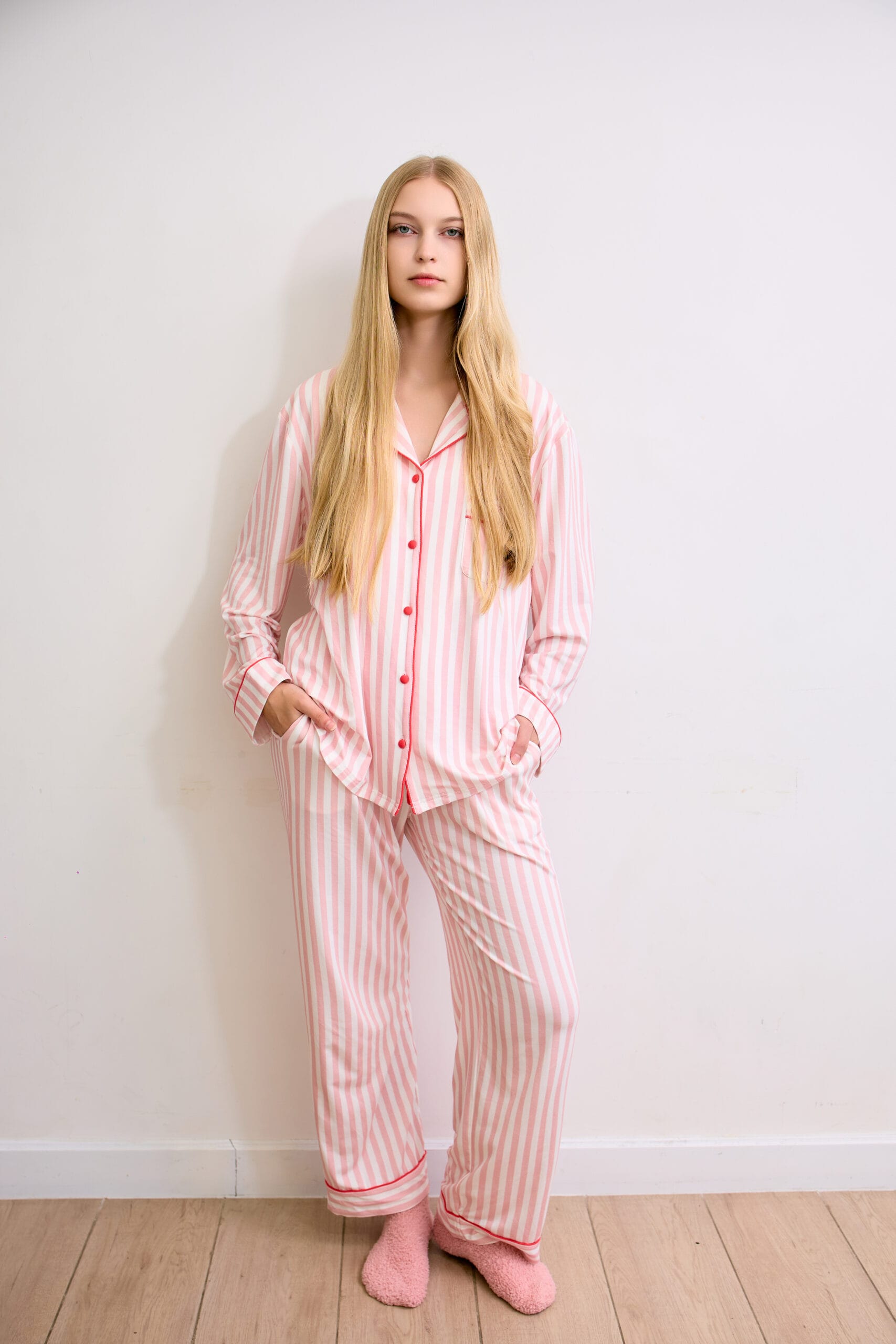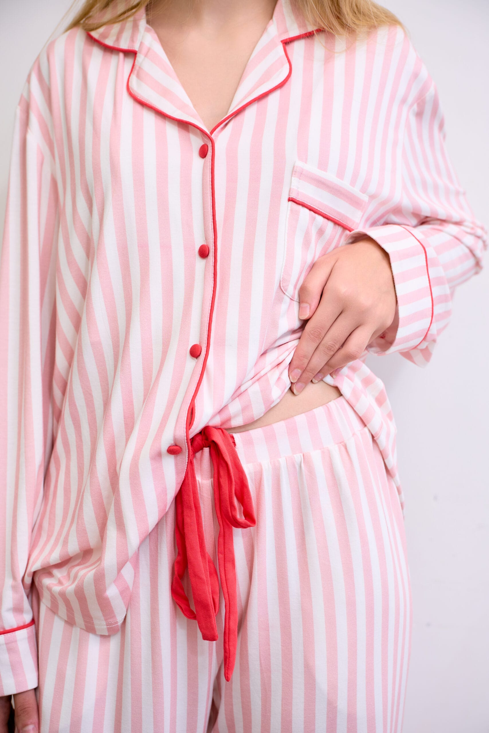 - Pant: Straight-leg pajama pant with an adjustable drawcord waistband and side pockets, soft stretch for a flattering, unrestrictive fit.