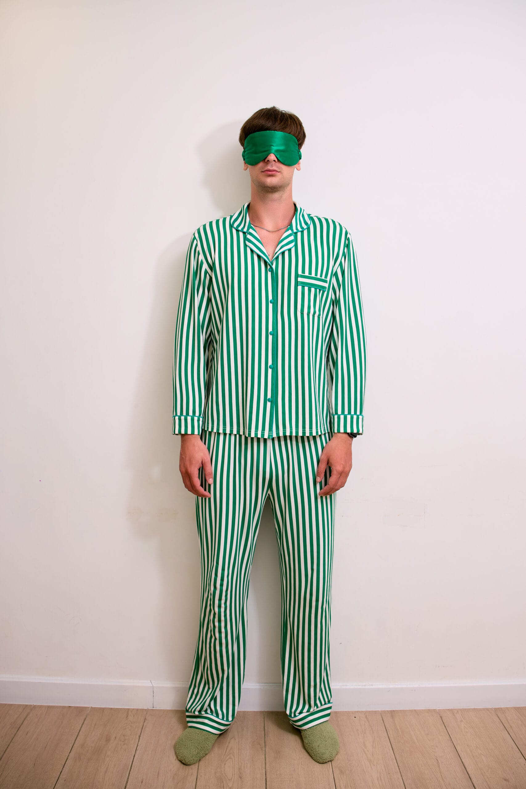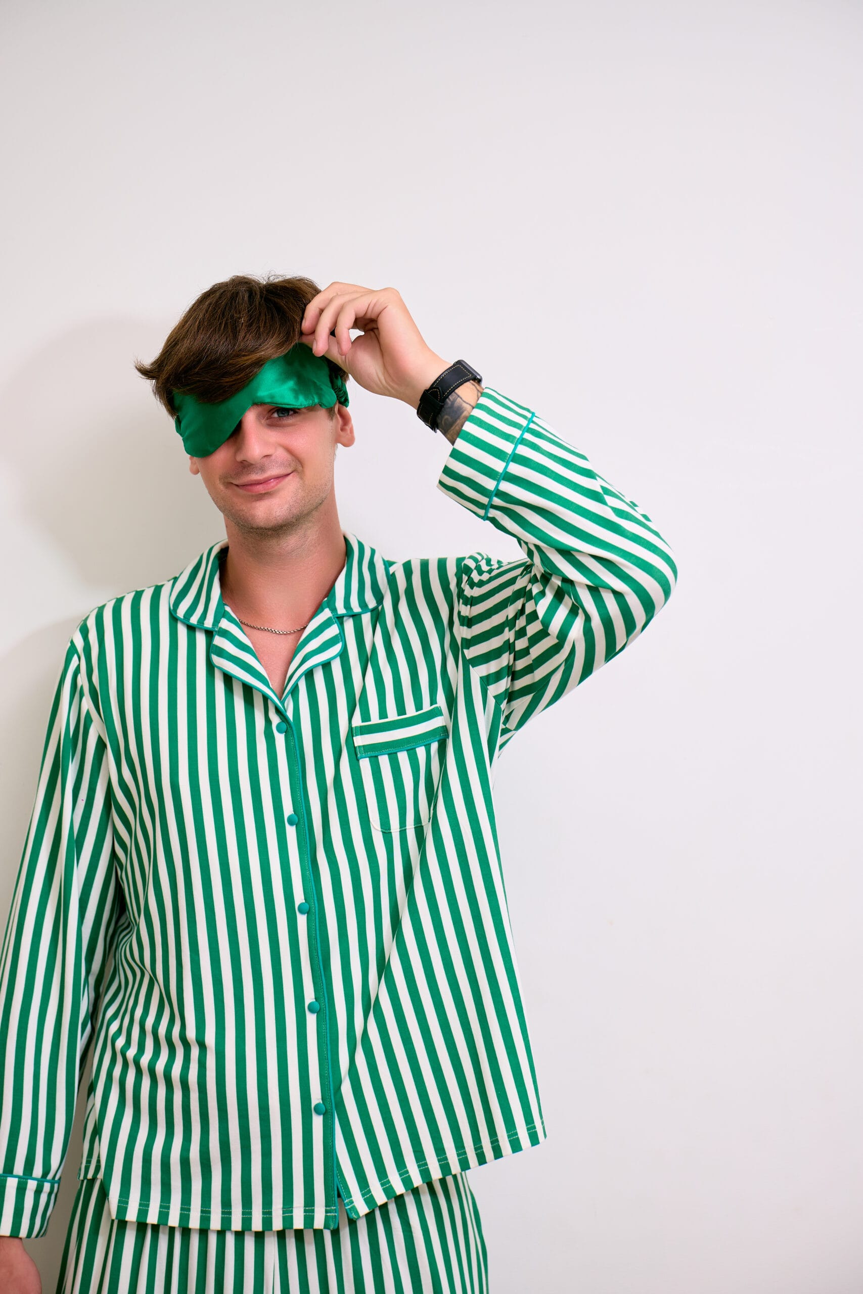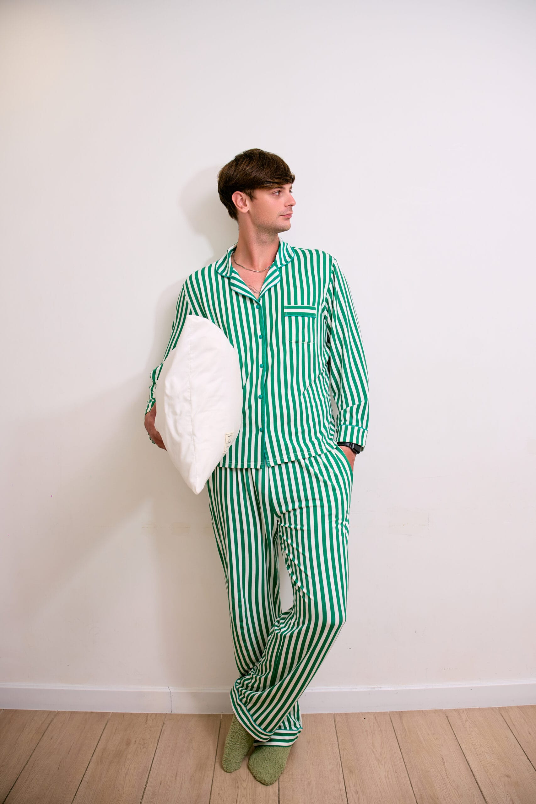 - Top: Classic long-sleeve button shirt with tonal piping, chest pocket, and a relaxed silhouette for all-day ease.